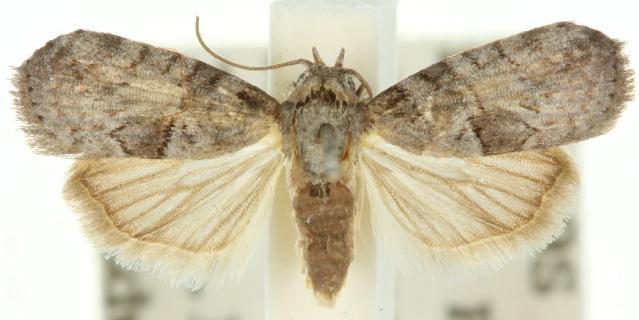 The adult moth of this species has forewings that are grey-brown, each with various dark markings including a vaguely double dark band near the base. The hindwings are white shading to brown at the edges. The wingspan is about 1.5 cms.