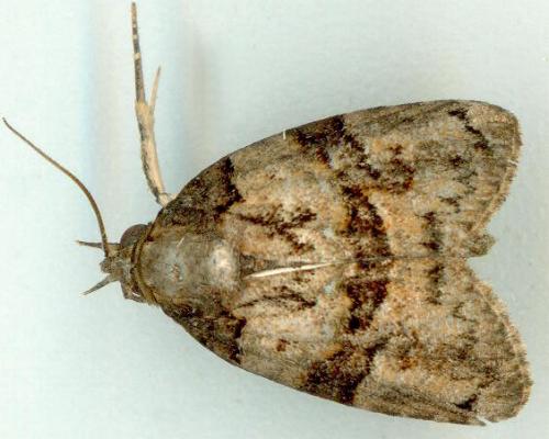 The adult moth of this species has forewings that are grey-brown, each with variable dark markings including a vaguely double dark band across the middle. The hindwings are white shading to brown at the edges. The wingspan is about 2 cms.
