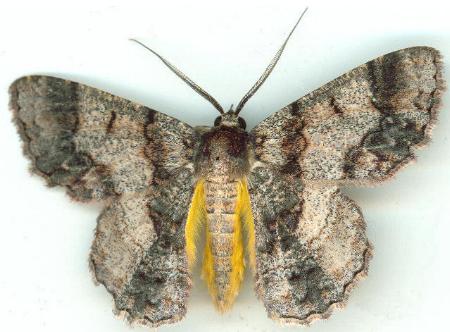 The adult moths are variable: usually an earthy grey with patterned bands of darker grey across the wings.