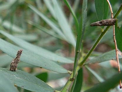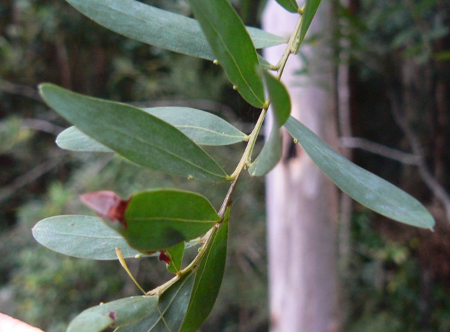 Foliage consists of grey green phyllodes. These are 2 to 6 cm long, (much longer than they are wide), usually narrow lanceolate but sometimes with a slight sickle shape. Whilst the mid-vein is obvious, the name for this wattle comes from the prominent gland on the margin, about a ¼ way up the phyllode from the stem.