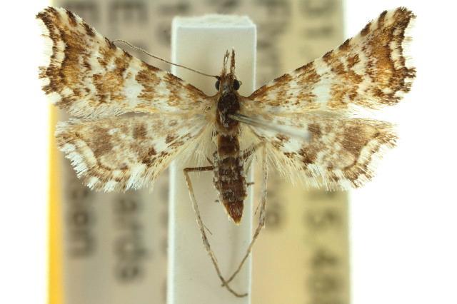 The adult moths of this species have brown wings, each with three irregular white transverse bands, and with hooked wingtips. The wingspan is about 1.5 cms.