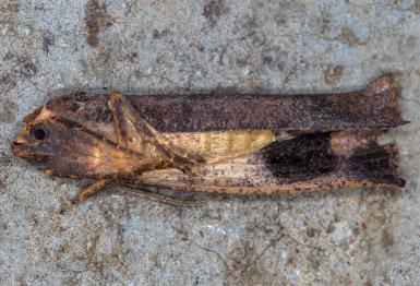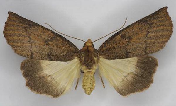 The adult moths of this species have forewings that are brown, each with two dark vague transverse zig-zag lines, and some orange veins. The hindwings are off-white with broad brown margins. The head and thorax are orange.