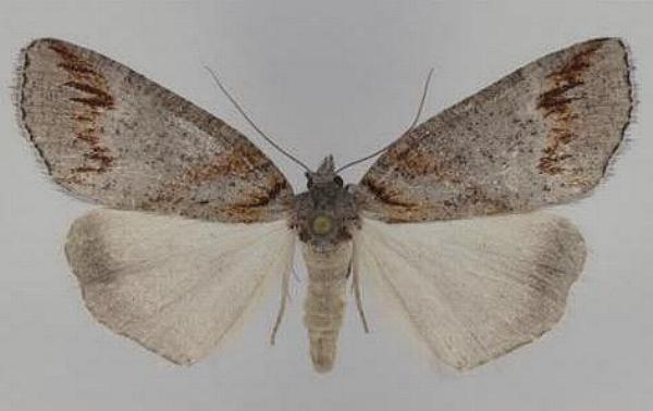 The female adult moths have grey forewings, each with striated rusty marks in an irregular submarginal band and at the base. The antennae are thread-like.