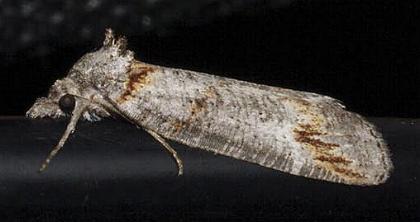 The males only have rusty striations by the wingtips of the forewings. The antennae of the males are feathery. The hindwings of both sexes are are off-white, each with a brown band along the margin. The wingspan of both sexes is about 3 cms.