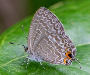 Underneath, both sexes are pale grey, with multiple arcs of white dashes, and a black spot by the tail surrounded in orange. The butterflies have a wing span of about 2 cms.