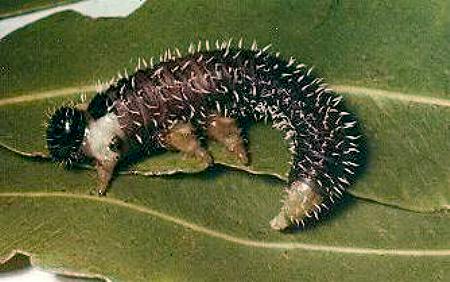 The larvae of this species have a blue-black body with white areas, with the body tapering towards the tail. The larvae are covered in short white bristles.