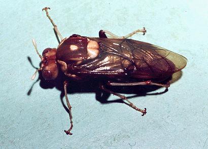 An adult insect (it is misnamed as a 'fly') is big and dark brown or black, with a white spot on the thorax, and a wing span of about 4 cms. The female lays her eggs in a slit she cuts between the upper and lower surfaces of a leaf of a food plant.