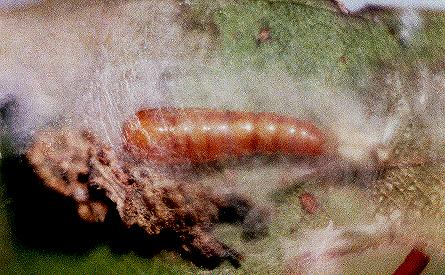 This Caterpillar was fawn with a pair of dark dorso-lateral lines, and a yellow head. It lived between a pair of leaves of its food plant joined by silk. It was found on