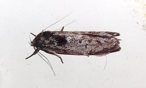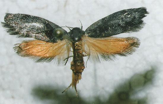 The moth emerged in about a week in spring in Sydney. It was fawn with a dark splotch on each fore wing beside the hinge. The hind wings were yellow with a black border. It had a wing span of about 2 cms.