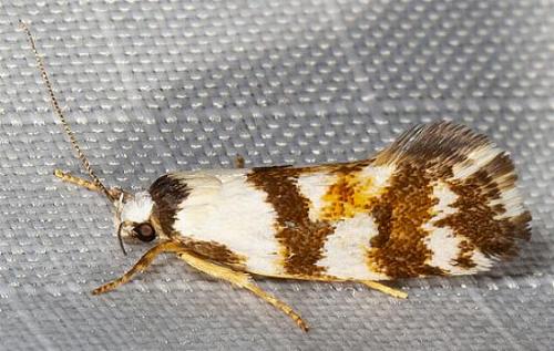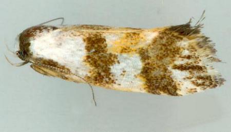 The adult moths of this species have white forewings, each with a yellow patch and a number of vague dark brown patches. The hindwings are a shiny pale brown. The wingspan is about 2 cms.