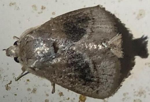 The adult moth of this species has forewings that are pale brown with some dark speckles, and with a dark-edged pale diagonal line separating a variable darker central area. The hindwings are plain pale brown. The wingspan is about 2 cms.