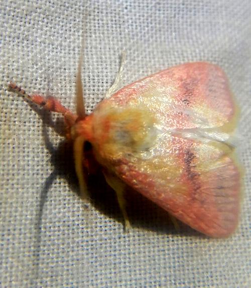 The adult moths of this species have pale pink or yellow forewings, each with broad red veins, a grey area at the base, two grey tranverse lines, and pale yellow hairs along the margin. The hindwings are pale yellow with narrower red veins. The head, thorax, abdomen, and legs are densely covered in pink and brown hair-like scales. The wingspan is about 3 cms.
