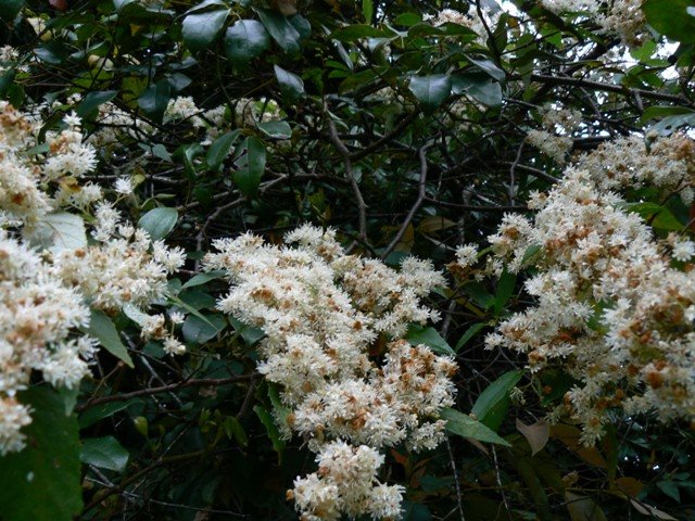 Looking almost like last minute spring snow fall dusting the branches (if we had such a thing in temperate Australia) - and flowering in September-October, is a native shrub in the STERCULIACEAE family: Commersonia fraseri. If we are lucky it may even continue with the odd extra flower until January. This long flowering season is likely if we have a wet spring and summer. When that is the case the shrubs often flower again in March. If you are travelling around the coast the shrubs are most noticeable where a bridge crosses a creek. There you will see a mass of white flowers in the gully alongside.