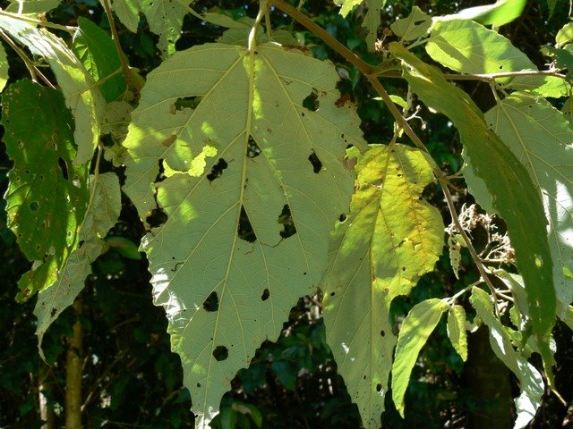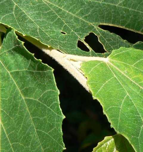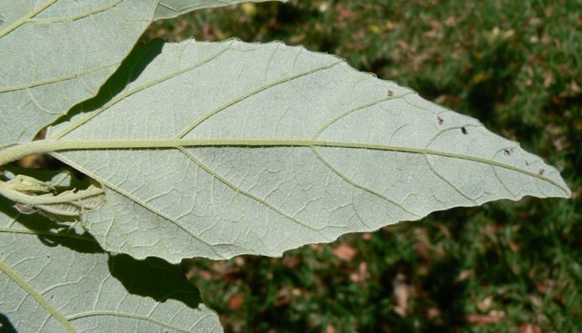 The leaves are alternate, simple and variable in shape. Juvenile leaves are broad, jagged and softly hairy, feeling a little like fine, soft velvet, with a fine point at the tip. They are dull on both sides, dark green above, white hairy beneath. Main lateral veins are clearly visible on both sides of the leaf. There are usually five veins, each ending in a larger tooth on mature leaves.
