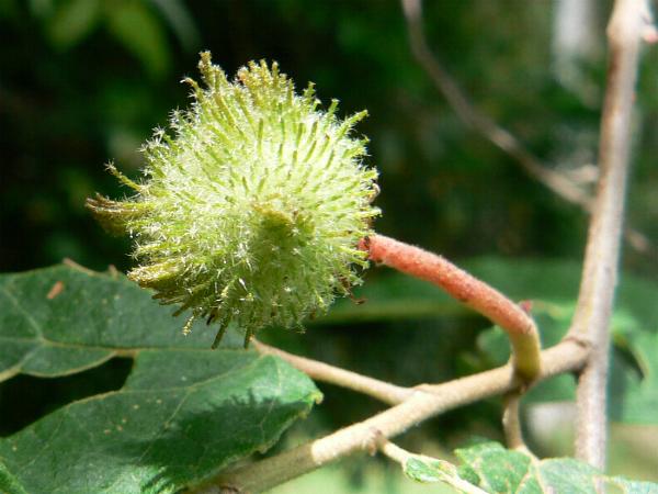 The fruit is 15 to 25 mm across and covered with soft bristles 5 to 10mm long. They open into five cells, each with two angular, egg-shaped, dull black seeds.