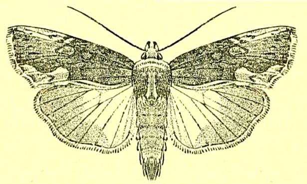 The forewings of the adult moth each have a complex pattern of light and dark greyish brown, with an irregular pale streak along the hind-margin. The hindwings are white with broad dark brown margins, and with dark veins. The wingspan is about 4 cms.