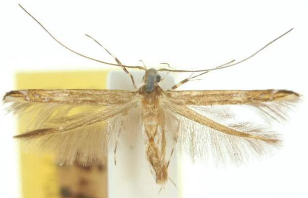 The moths of this species are brown with dark areas at the wingtips. The moths have a wingspan up to about 1.5 cms.