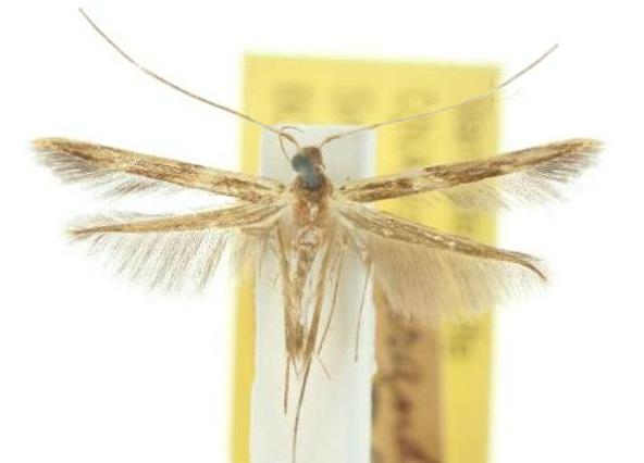The moths of this species are brown with a dark streak along each forewing. The moths have a wingspan of about 1.7 cms.