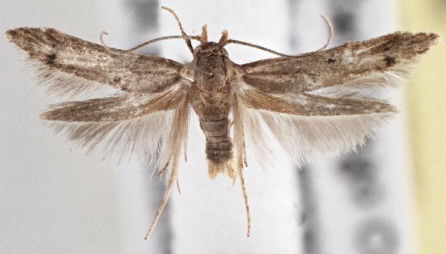 The adult moths of this species have forewings that are pale brown each with a darker band and two dark spots, and that have fringes along the hind margin that are longer than the width of the rest of the wing. The hindwings paler and narrower, and have fringes along the costa and even longer ones along the hind margin. The wingspan is about 1.5 cms.