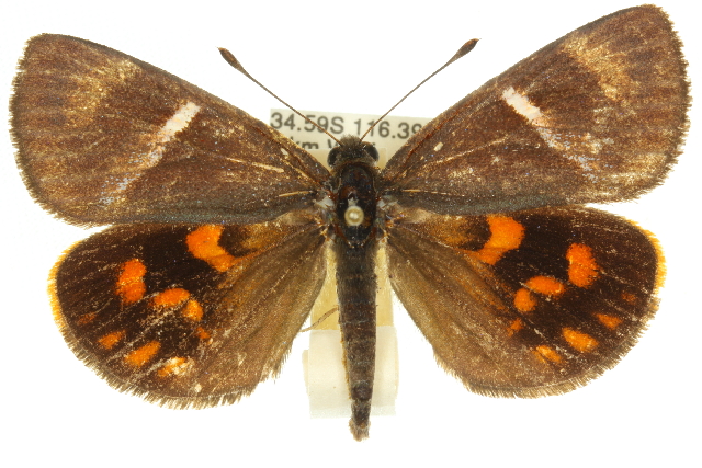 The adult moth of this species has darkbrown forewings each with a large vague pale brown letter 'h'. The hindwings are dark brown, each with a number of orange spots. The wingspan is about 5 cms.