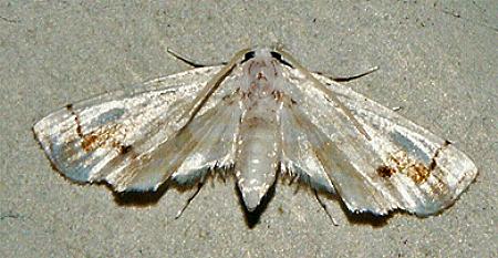 The adult moth of this species has white wings with wavy pale bands across them. The forewings each have a wide rusty brown mark near the middle above a dark dot. The wingspan of the males is about 2 cms. The wingspan of the females is about 4 cms.
