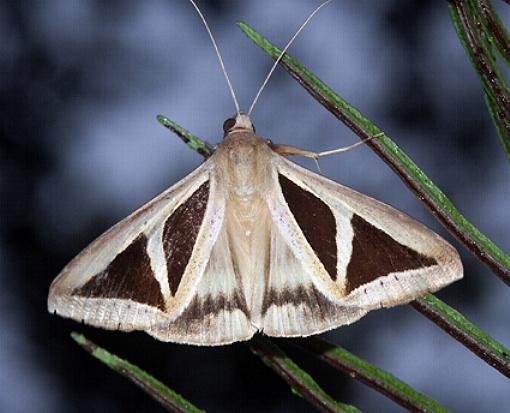 The adult moth has pale brown forewings with large dark brown triangle in the middle. The hindwings are pale brown with a dark submarginal arc of dark marks. The dark brown triangle on each forewing is transected by a broad pale diagonal band from mid-costa to tornus.