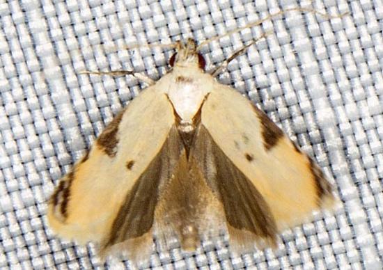 The adult moths of this species have yellow forewings with two dark brown triangles on the costa of each forewing. The hindwings are brown. The wingspan is about 1.2 cms.