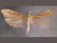 The forewings of the adult moth have off-white forewings, each an irregular broad pale brown streak along the costa and along the hind-margin, and pale brown marginal and submarginal bands. The hindwings are pale brown. The wingspan is about 1 cm.