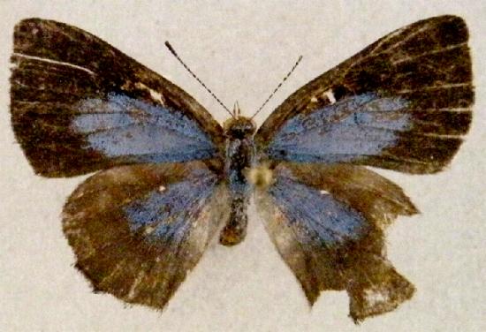 The two sexes of the adult butterflies of this species on top are different, but both are black with a large metallic blue patch in the centre of each wing. The blue patches for the males are bigger than those of the females.