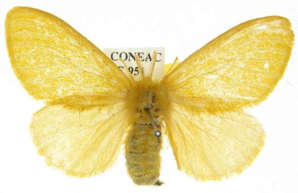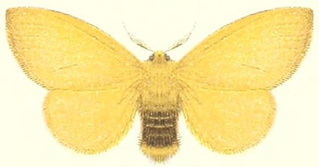 The adult moth of this species appears to be yellow all over, although the specimen that Strand described and illustrated had a black abdomen. The moth has a wingspan of about 4.5 cms.
