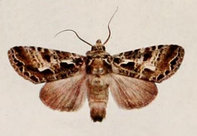 The adult moths of this species have speckled white and brown forewings with green tinges. The female has rather more white markings. The hindwings are plain brown. The green markings fade to brown in dead specimens. The wingspan is about 5 cms.
