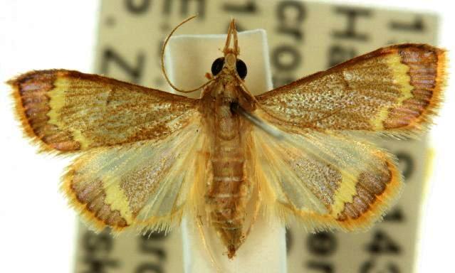 The adult moths of this species have pale brown forewings, each crossed by an angular pale yellow scalloped transverse bar. The hindwings are pale brown, each crossed by a straight pale yellow scalloped transverse bar. The wingspan is about 3 cms.