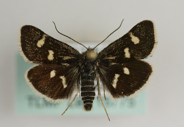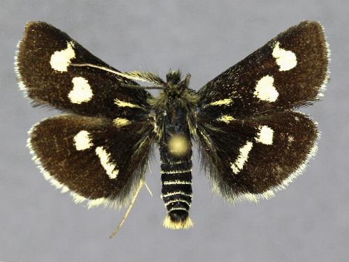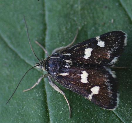 The adult moths have black wings, each with two off-white marks. The wingspan is about 2 cms.