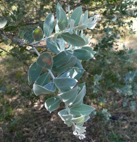 Acacia podalyriifolia can be anywhere from 2 to 6 metres tall with a spread of 2 – 4 metres, so a nicely-shaped, rounded shrub/tree. The bark is smooth or sometimes finely fissured and continues the silvery grey theme.