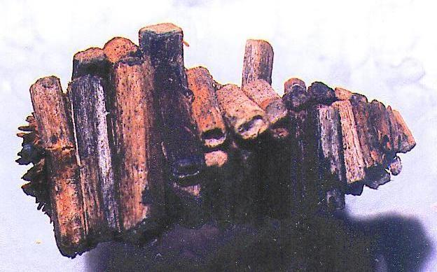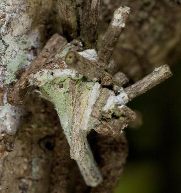This Caterpillar initially attaches four sticks in a square around its case, all of the same length, and attaches them at right angles to the axis of the case. As the caterpillar grows when sufficiently longer, it attaches a new set similarly arranged to the old set, except that they are slightly longer, so that the the new part of the case is bigger, and twisted slightly about 7 degrees anticlockwise (viewed from the small end) to the previous set.