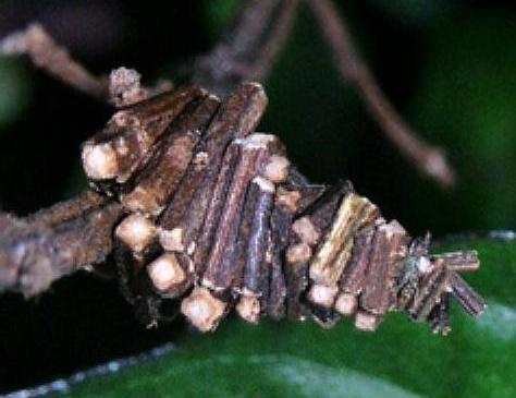 This Caterpillar initially attaches four sticks around its case, all of the same length, and attaches them at right angles to the axis of the case. When the caterpillar grows sufficiently long, it attaches a new set similarly arranged to the old set, except that they are slightly longer, so that the new part of the case is bigger, creating a pyramid structure.