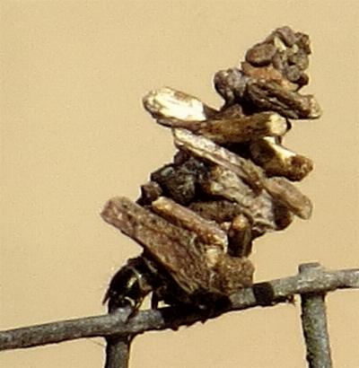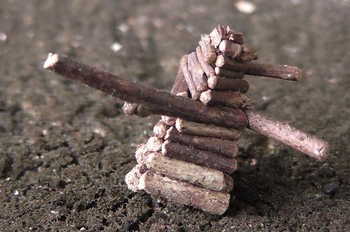 This Caterpillar initially attaches a set of three or four sticks in a triangle or square around its case, generally all of a similar length, attaching them at right angles to the axis of the case.