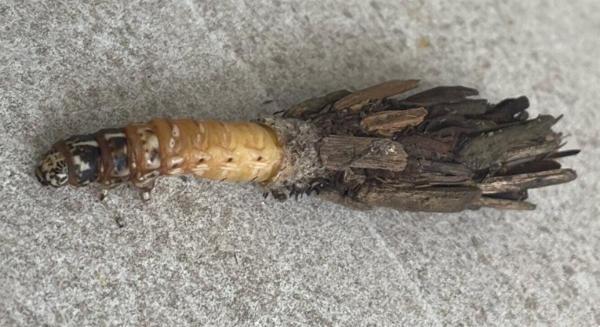 This Caterpillar covers its case with overlapping small flakes of bark. This is similar to Undetermined Psychidae AY, except that species lays the flakes alongside each other with no overlaps.