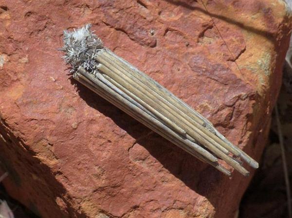 This Caterpillar covers its case with about two dozen thin sticks or dry stems of varying lengths aligned parallel to the case. This is similar to the case of Clania lewinii, but Clania lewinii has thicker sticks and fewer of them, and has them cut to more nearly the same length. The case is also similar to that of Undetermined Casemoth BK, but the head and thorax appear paler with more contrasting markings.