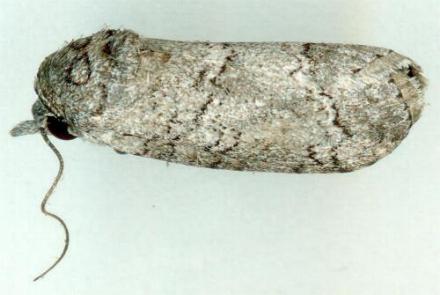 The adult moth has grey fore wings with a wavy light and dark pattern, and white hind wings shading to dark brown at the margins. The wingspan is about 2.5 cms.