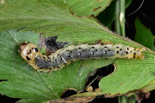 The Caterpillars of this species are off-white with a broad diffuse grey band along the back. The head has angular black marks, and each segment has four black warts. The caterpillar has been found feeding on