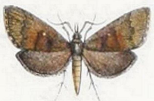 The adult moths of this species have dark brown forewings, each with various markings, including dark zigzag transverse lines and an irregular pale spot near the middle each forewing. The hindwings are brown shading darker at the margins, with obscure dark zigzag lines.