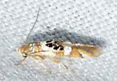 The adult moths are yellow with a pattern of white, grey, black, pink, and blue on each forewing, although the colours fade to various shades of brown in museum specimens. The hindwings are plain brown. The hind margin of each wing is heavily fringed with hairs. The wingspan is about 1 cm.