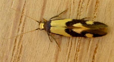 The forewings of the adult moth are black with yellow patches. The moth has a wingspan of about 1.5 cms.