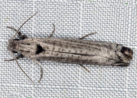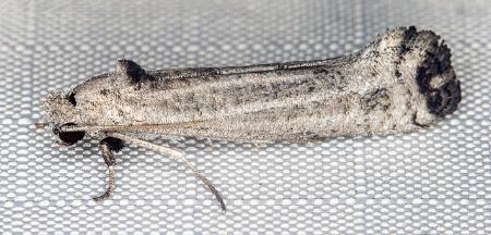 The adult moth of this species has grey forewings, each with arcs of dark speckles, and with dark splodges near the wingtip and the tornus. There is an erectable set of scales just behind the thorax. The wingspan is about 2 cms.