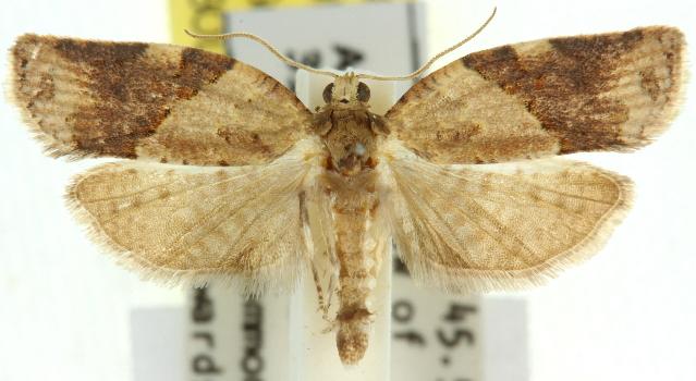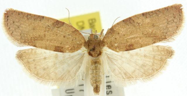 The hindwings are pale brown with faint dark spots and bands. The head is often white. The moths have a resting shape like the outline of a bell. They have a wingspan of about 2 cms.