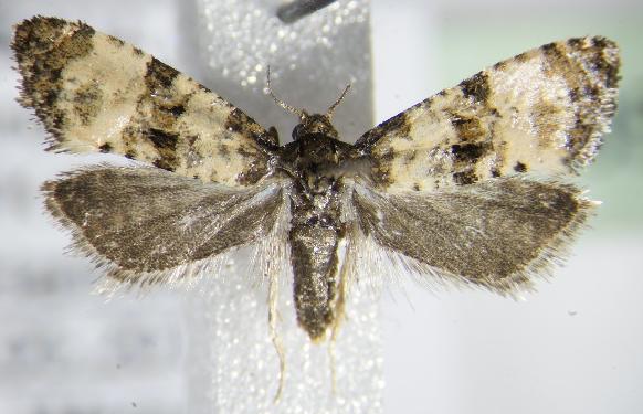 The adult moth has off-white forewings, each with dark brown markings including a patch at the base, a band across the middle, and along the margin. The hindwings are plain greyish-brown. The head and thorax are dark brown. The moth has a wingspan of about 14 mm.