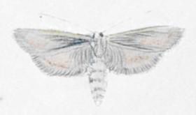 The adult moth has grey wings each with greenish and pinkish areas. The abdomen is white. The wingspan is about 2.5 cms.